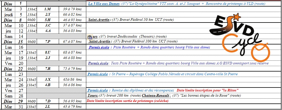 Mars 2026 En bleu les actions concernant les adhérants de la section